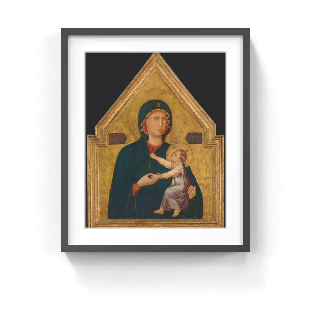 Master of St. Cecilia (Italian, active about 1290–1320) The Virgin Mary, hieratic and still, looks out toward the viewer while gently supporting Christ with her left arm. The smiling infant gazes lovingly toward her and playfully stretches out his arm, grabbing the edge of her gold-trimmed, blue cloak. The star over the Madonna's forehead refers to her title "Star of the Sea," the meaning of the Jewish form of her name, Miriam.
