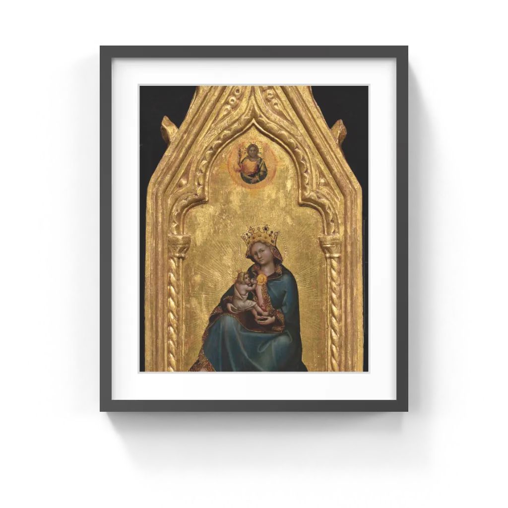 Guariento di Arpo (Italian, active 1338–1367/1370) Set against a gold background, the Madonna and Child sit enclosed in a Gothic frame with pointed arches and decorative twisting columns. In this single image, Guariento di Arpo combined three traditional pictorial representations of the Virgin. She sits on the ground nursing the infant Christ as the Madonna of Humility, a representation that emphasizes her role as the compassionate, maternal intercessor for all who pray for Christ's mercy. At the same time, her crown points to her role as the Queen of Heaven. Finally, identified by the golden sun-brooch at her breast and the incised rays that emanate from her, she personifies the apocalyptic woman from the twelfth chapter of the biblical Book of Revelation. Above, a golden aureole of celestial light encloses the blessing figure of God the Father.