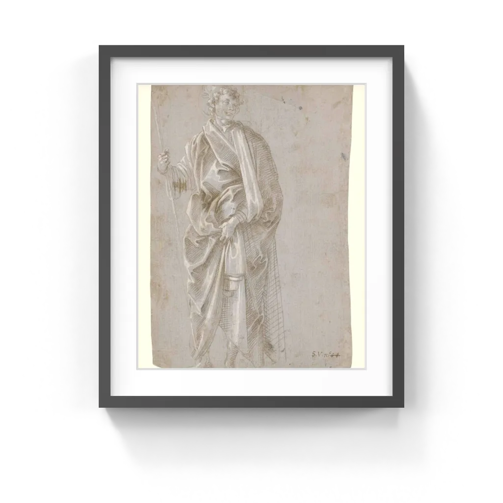 Filippino Lippi (Italian, about 1457–1504) Using metalpoint on light gray prepared paper, Filippino Lippi drew a male saint holding a staff or possibly a stemmed cross. He probably sketched from a model, likely his youthful assistant or apprentice, and used the drawing primarily as a drapery study. Scholars know neither the exact purpose nor the date of the drawing, although it may relate to a 1503 altarpiece. Few of Lippi's drawings directly relate to his paintings, and drawings for his altarpieces are scarce. This study represents a rare opportunity to witness his working method in the early years of the 1500s. On the verso Lippi drew the same model from life as a study of two standing youths, with other, fainter studies along the edges of the paper. These two figures seem to relate directly to the figure of Saint Sebastian in the altarpiece. The white lead highlights that Lippi applied to both studies show that the model was illuminated by a light source at the left. Lippi also drew cast shadows at the figures' feet.
