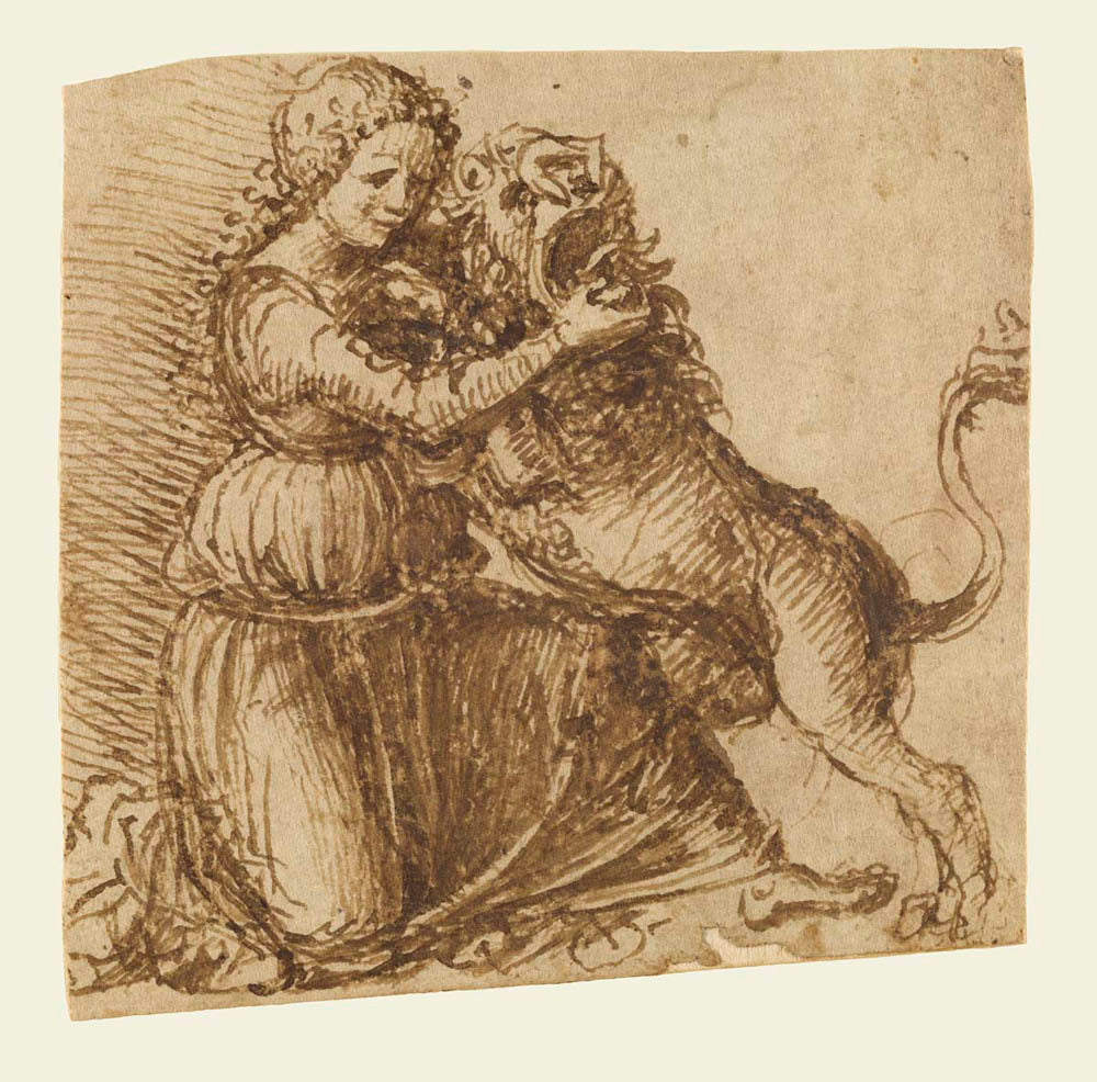 Giovanni Bellini (Italian, about 1431/1436–1516) A young woman with long, curly hair wrestles open the jaws of a lion. The play of light and shadow across her belted dress emphasizes the rounded curves of her body, while Giovanni Bellini's simple yet powerful portrayal of her wrestling grip emphasized his skill with contrasts. He drew the woman's delicate curls with circular strokes, subtly different from the looser, curving lines of the lion's mane. Bellini displayed a confident and assured touch unusual for such a small-scale work.