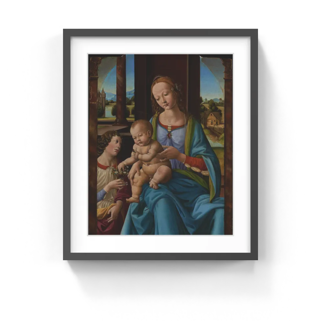 Studio of Lorenzo di Credi (Lorenzo d'Andrea d'Oderigo) (Italian (Florentine), about 1456–1536) An artist in Lorenzo di Credi's large workshop probably made this painting under the master's direction, adapting elements from various other paintings. The apprentice or journeyman took the composition from an altarpiece begun by another artist and finished by Lorenzo. The two landscapes in the background look quite different, since they derive from two different landscape traditions. The apprentice copied the landscape with a water mill on the right from an altarpiece by Hans Memling, whose Northern Europeans landscape paintings were being imported to Florence around this time, and took the landscape on the left from other works by Lorenzo. The anonymous artist adopted Leonardo da Vinci's early color scheme of delicate light blue, red, and pale violet for the Madonna's garments.