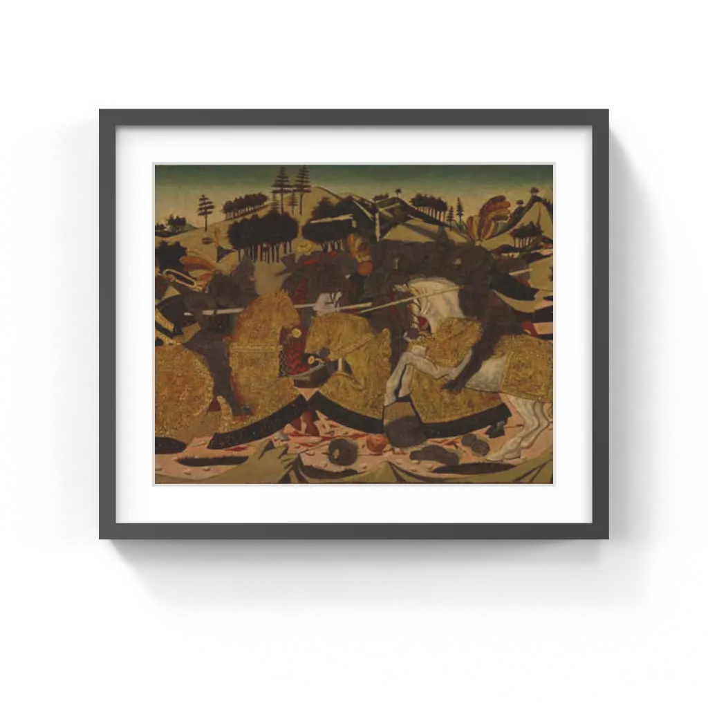 Giovanni di Ser Giovanni Guidi (Lo Scheggia) (Italian (Florentine), 1406–1486) These fighting knights carry the banners of ancient feuding empires--SPQR, the banner of ancient Rome, at the left, and the dragon, that of Gaul, at the right--yet they wear contemporary gold and silver Florentine armor and joust like Florentine knights of the 1400s. The brilliant colors and simplified geometric shapes make the armored steeds look much like rocking-horses, creating a resplendent yet artificial, fairy-tale battle scene. Despite the flatness of the sumptuous painted fabrics and the mere outlines of the horses' bodies--aside from the elegantly foreshortened white horse at the right--their hooves appear to exist in three-dimensional space.