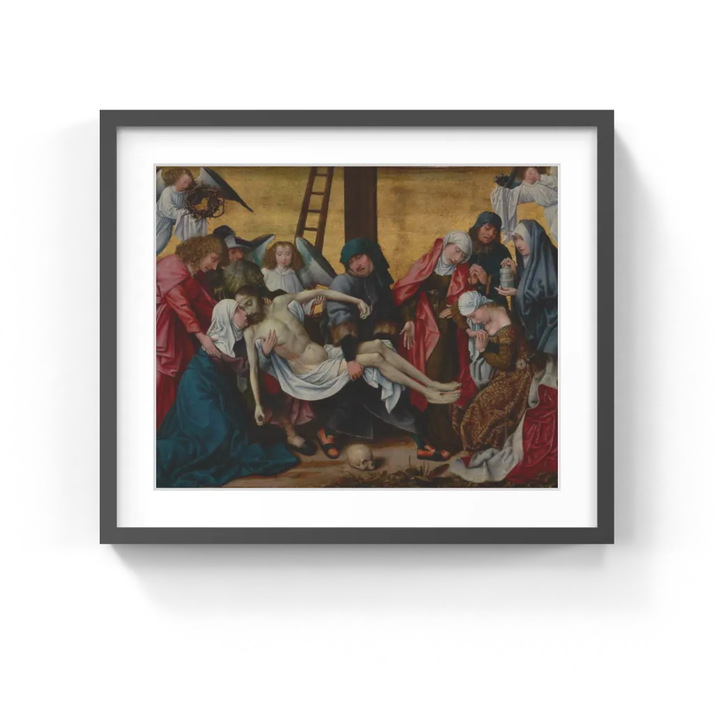 Follower of Rogier van der Weyden (Netherlandish, 1399/1400–1464) Two of Christ's followers, Joseph of Arimathea and Nicodemus, carry his body from the cross to the tomb. Mary, his mother, kneels and pulls her son's face close to hers for one last moment, while Mary Magdalene kneels tearfully at his feet in splendid brocaded robes. Death has transformed Christ's green-tinged, rigid body in horrific detail: his hands are clenched into agonized claws, bloody scars from his Crown of Thorns dot his forehead, and his wounds are graphically evident.