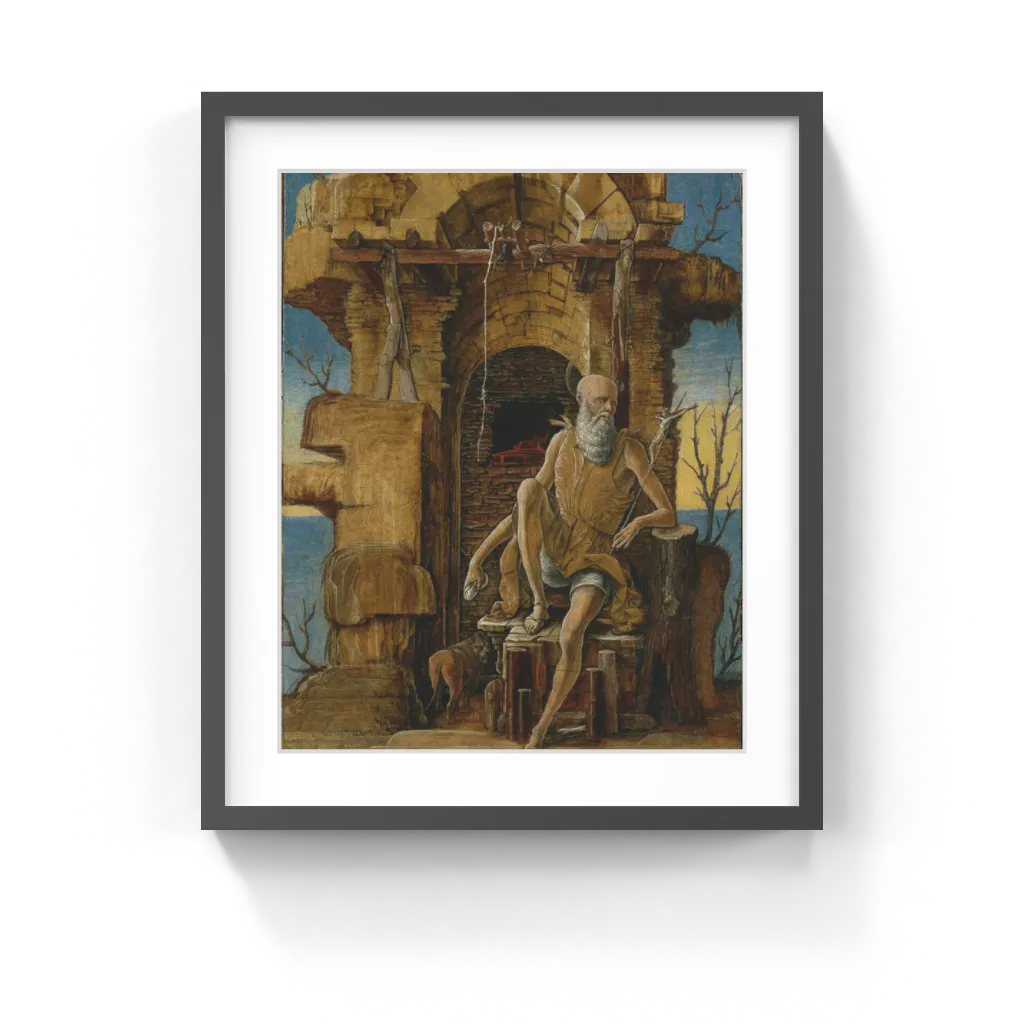 Ercole de'Roberti (Italian, about 1450–1496) For four years, Saint Jerome retreated to the desert, where he purified his soul through physical suffering. The bearded saint sits in front of a barren and rocky background, his emaciated body a testament to his ascetic life. He directs his gaze to a crucifix that he holds in his left hand. During his time of religious contemplation, Saint Jerome was tormented by vivid hallucinations; his right hand clasps a rock with which he would beat his breast until the visions passed. A nook in the vaulted structure behind him holds his attributes: a cardinal's hat and a book referring to his translation of the Bible into Latin. A small lion inside the shelter recalls the fable in which Jerome pulls a thorn from a lion's paw, forever securing the animal's devotion. Ercole de'Roberti was artist to the court of Ferrara in northern Italy. The elongated forms, taut, linear rhythms, subtle colors, and meticulous, gold-flecked details of this painting convey the sophistication prized by Ercole's aristocratic patrons. This small devotional painting demands a focused concentration from the viewer that echoes Jerome's efforts to come closer to God.