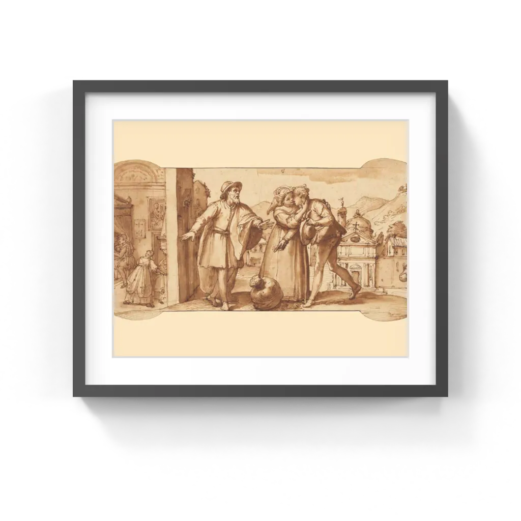 Federico Zuccaro (Italian, about 1541–1609) This story in three scenes moves from right to left. First Taddeo Zuccaro returns home, slack-mouthed with exhaustion, carrying the heavy sack of stones he gathered on his back. As biographer Giorgio Vasari explained, Taddeo "carried them home and gave them to his mother, telling her they were even more precious than himself." In the center, Taddeo's parents welcome the young man warmly as he deliriously points to his heavy bag. On the left, he lies in bed, watched over by his parents and his little brother, the artist Federico Zuccaro. A large carved wooden bed with a canopy nearly fills the room. Several paintings and a frescoed cornice on the far wall and a fireplace projecting from the hidden wall form the other handsome furnishings.