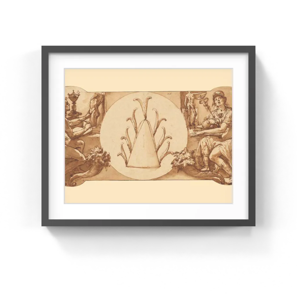 Federico Zuccaro (Italian, about 1541–1609) Allegorical figures of Study and Intelligence sit on either side of the Zuccaro family's symbol of a sugar loaf sprouting lilies, a play on the Italian word