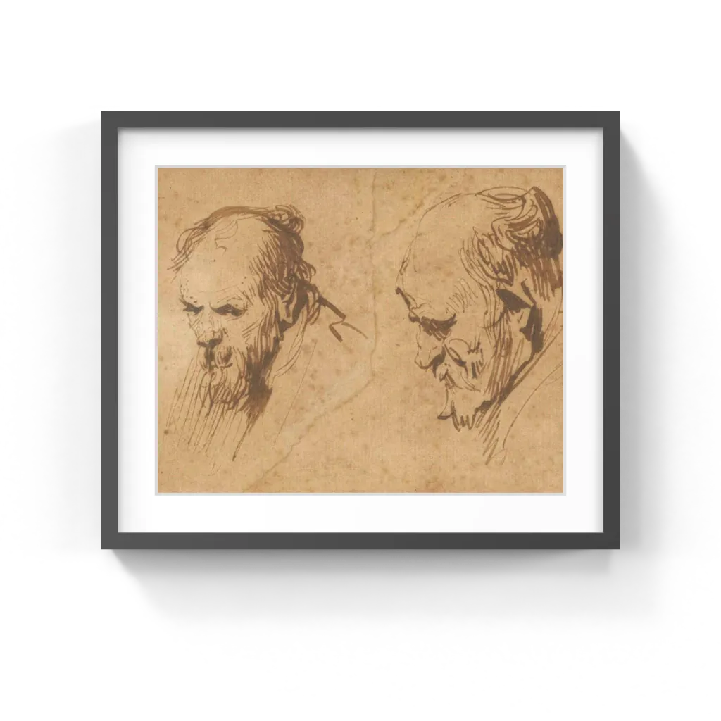 Rembrandt Harmensz. van Rijn (Dutch, 1606–1669) In his bold, vigorous, and economical style, Rembrandt Harmensz. van Rijn examined this man's pensive face from two directions. He presented the eyes as dark caverns, with shadows alone defining the ear, cleverly allowing the blank paper to do the rest. Broad pen strokes develop areas such as the neck, shoulder, and back of the head.