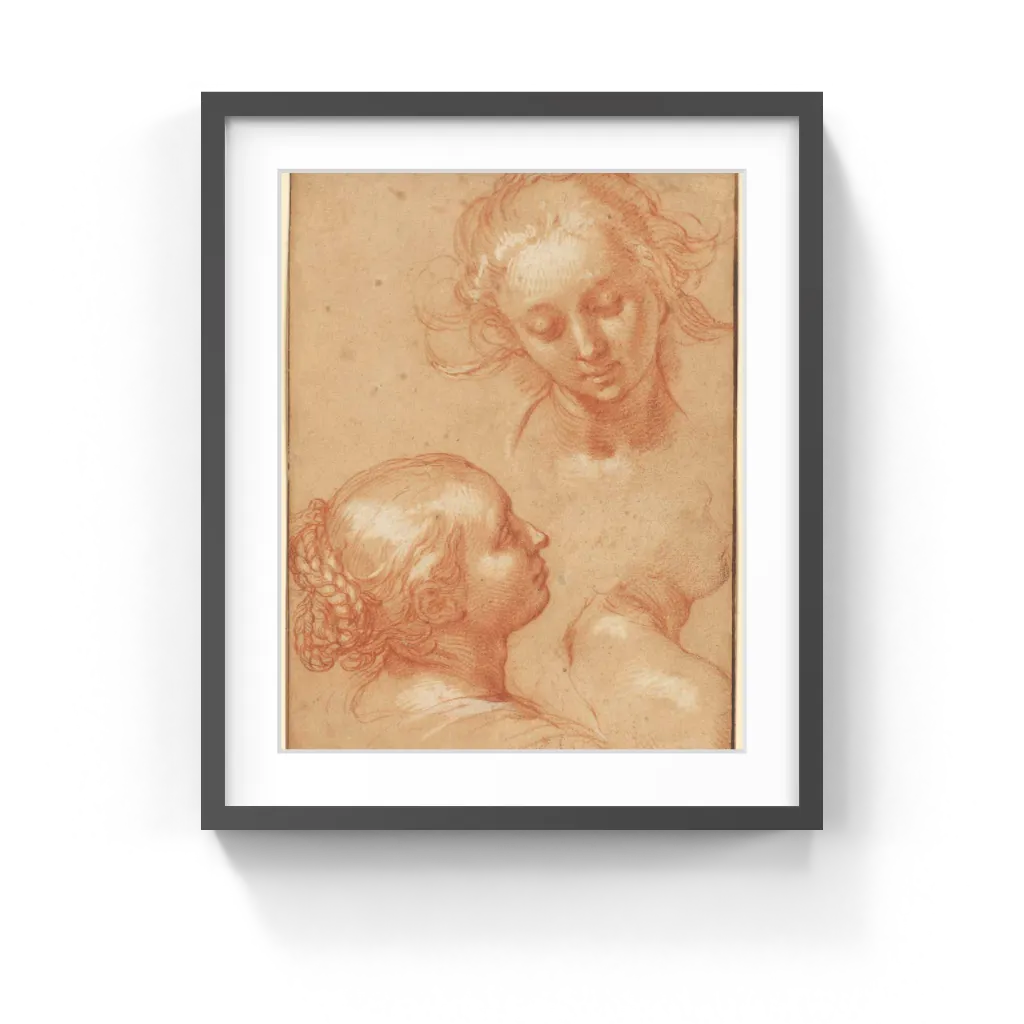 Abraham Bloemaert (Dutch, 1564–1651) The soft, smooth skin of this female model seems to glow from within. From the soft, firm contours to the graceful wisps of hair that frame her head and neck so naturally, Abraham Bloemaert delicately modulated his red chalk line on creamy paper. Subtly and sensitively, he then touched in the white bodycolor that makes her luminous skin seem alive. Bloemaert probably made these studies for general practice; no paintings or prints directly relate to this sheet, though the lower profile image recalls an engraving after one of his designs.