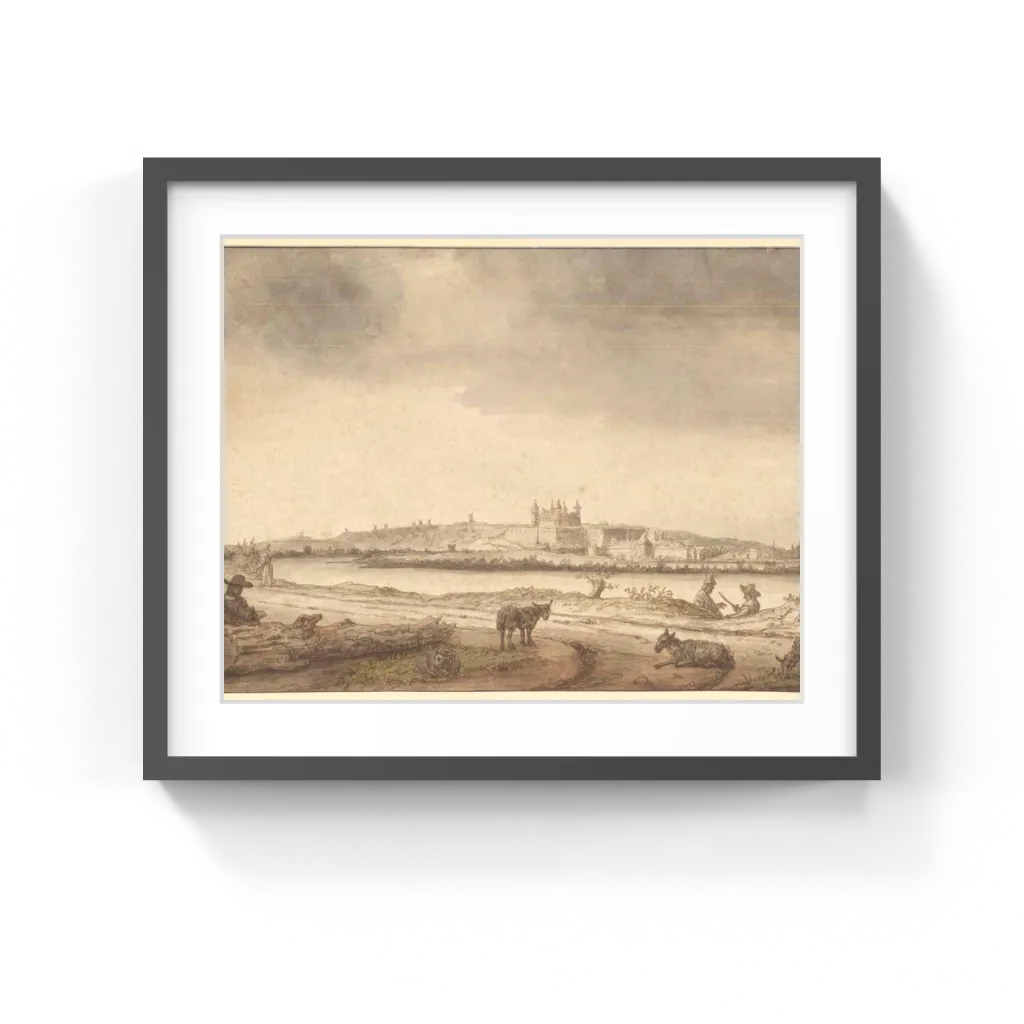 Lambert Doomer (Dutch, 1624–1700) About 1670, Lambert Doomer made this drawing following an earlier drawing composed during a trip to northern France in 1646. While carefully depicting the town of Saumur's landmarks, he added local citizens and animals to give the vista a picturesque effect. He enlivened the scene with color, using subtle modulations of wash to suggest the sky's atmosphere and light and shadow on the ground.