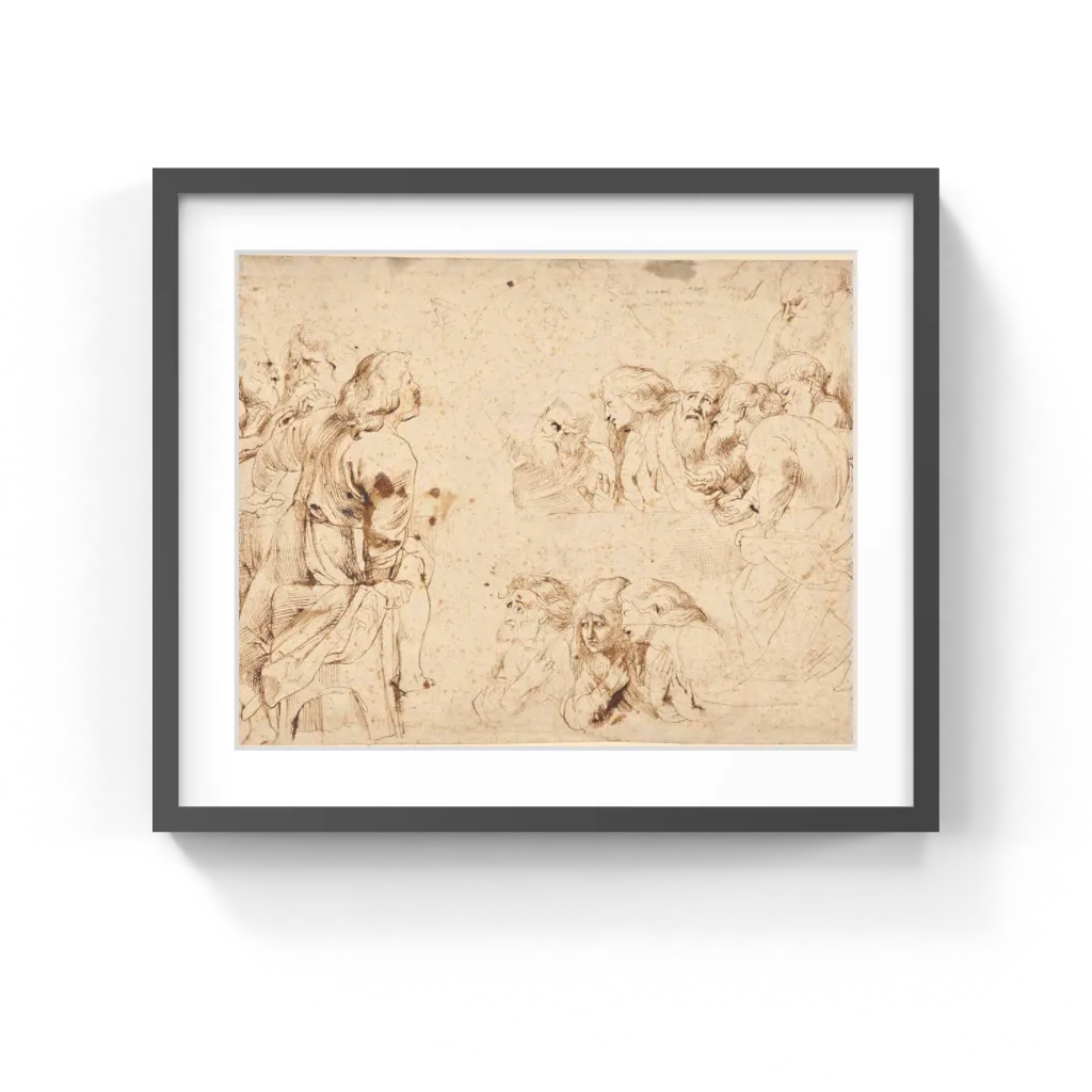 Peter Paul Rubens (Flemish, 1577–1640) The recto or front of this sheet depicts three independent groups of apostles and two faint, lightly drawn sketches all related to a representation of the Last Supper. Peter Paul Rubens drew on many Italian models, including works by Leonardo da Vinci, Caravaggio, and Michelangelo, for inspiration in depicting the individual apostles. Rubens used a thin, fine line for the monumental figures of the apostles and cross-hatching to convey their solid forms.