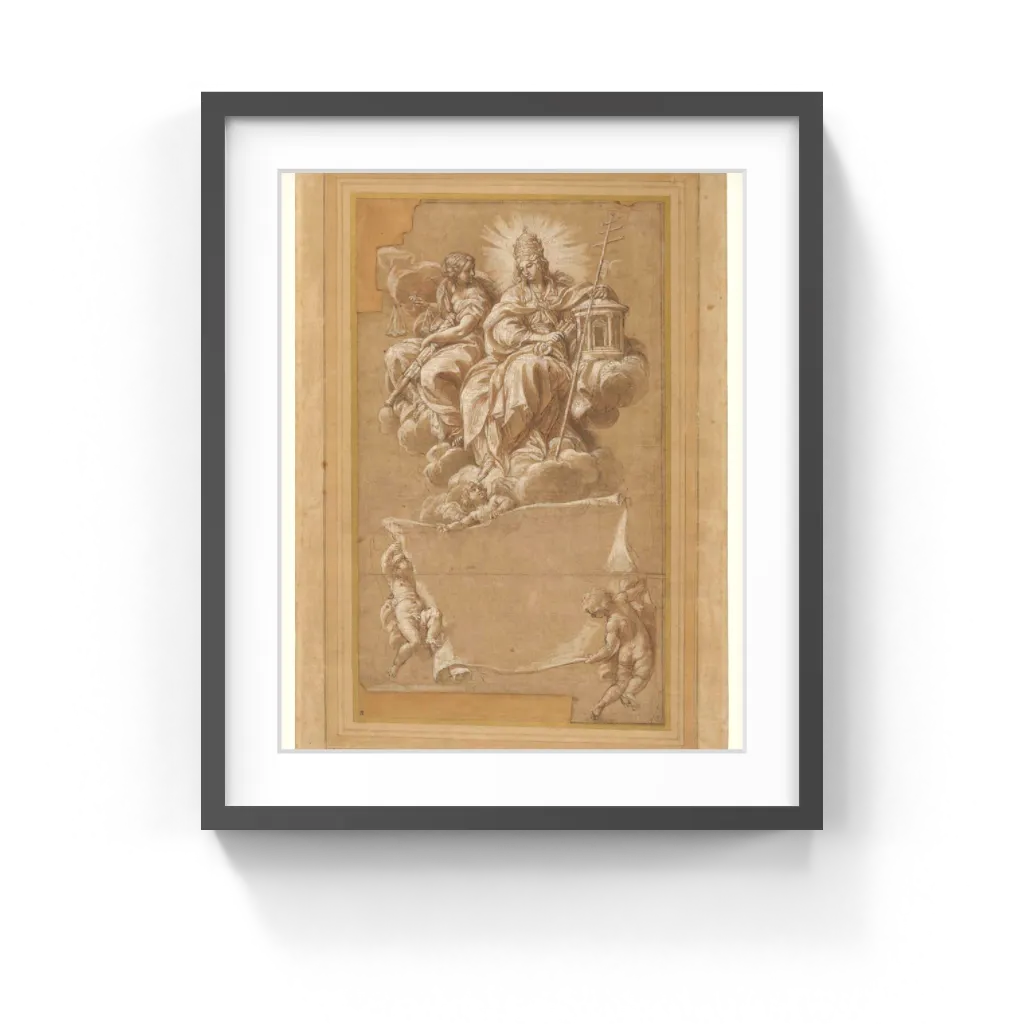 Carlo Maratti (Italian, 1625–1713) Floating on a throne of clouds, the figures Justice and Faith look down on three putti who hold up an empty scroll. One of the virtues, Justice, sits on the left, holding the scales in one hand as a symbol of her impartiality. Between her knees lies a fasces, a bundle of wooden rods enclosing an ax, used by ancient Roman magistrates as an emblem. On the right sits Faith, with light shining from her head. Holding the key to the church in one hand and a crosier and model of a church in the other, she wears a papal tiara to protect her from the attack of heretics.