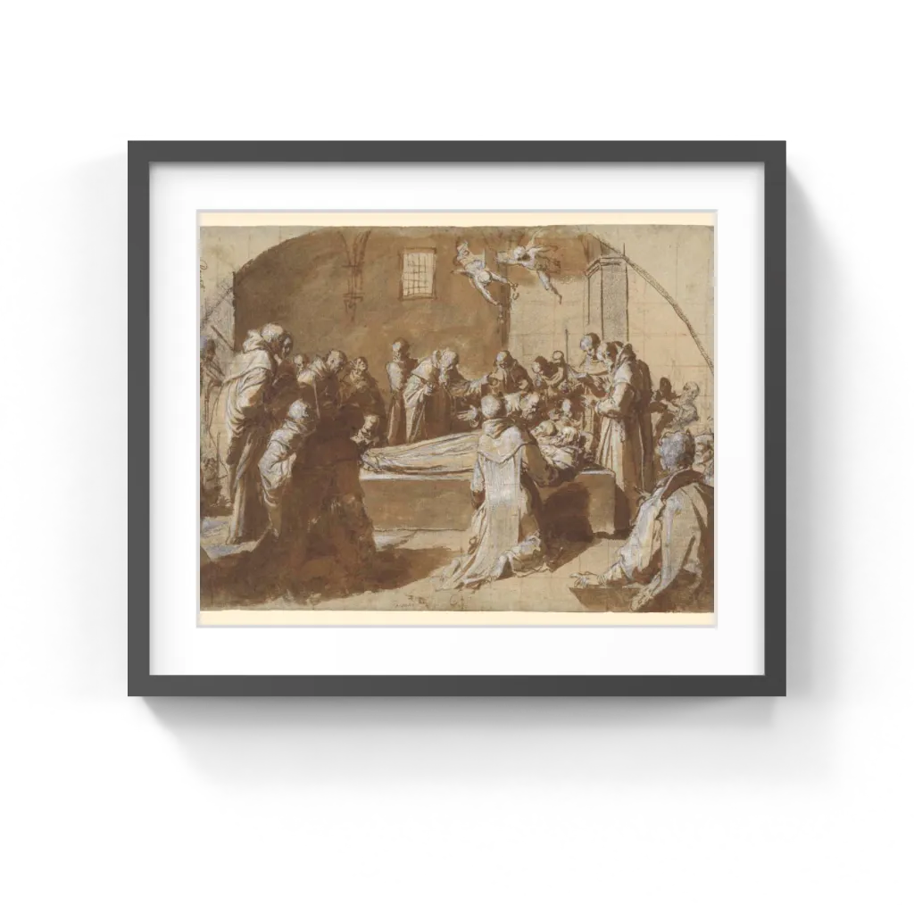 Bernardino Poccetti (Barbatelli) (Italian, 1548–1612) While two angels flutter overhead, ready to guide their souls into heaven, the bodies of the blessed monks Ugoccione and Sostegno lie in state surrounded by other brethren of the Servite Order. To give the scene a sense of greater depth, Bernardino Poccetti used a rather broad and deep spatial arrangement. The arched ceiling draws the viewer's eye into the setting, while contrasting patches of dark shadow and light keep it moving. A monastery commissioned Poccetti to produce a series of fourteen frescoes with scenes from the lives of the monastery's founders, and he made this elaborate study for one of them.