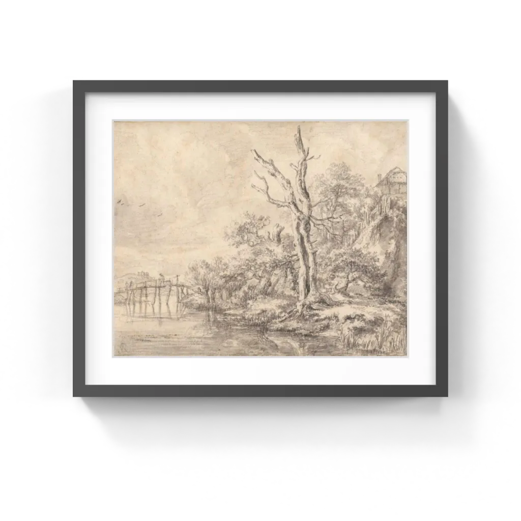 Ruisdael focused this composition around a hollow tree whose bare limbs reach upward: a heroic element in the landscape. Its lifeless skeleton symbolizes the transience of human life, a favorite Ruisdael theme, and reminds viewers of the suffering and endurance required in life. Yet Ruisdael also set the dead tree amidst healthy ones, showing that both life and death have a share in nature. To balance the scene compositionally, Ruisdael contrasted the dramatic tree with a placid stream and picturesque footbridge on the left.