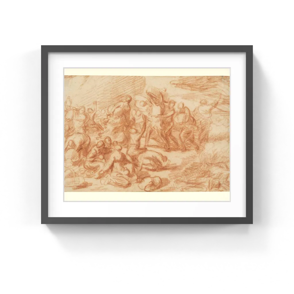 Thus Nicolas Poussin explained his tendency to balance and choreograph even the violence and haste inherent in his narrative subjects. In drawings such as this one, he worked out the structure of a composition using clear strokes that captured the figures' essential gestures or shapes. He then toned down the movement, gesture, and tumult in the final painting. This is a typical development for most painters, but one even more conspicuous in Poussin's work. He made this study and at least five others in preparation for a painting commissioned by a member of an illustrious Italian family prominent in government and civic affairs and active patrons of the arts.