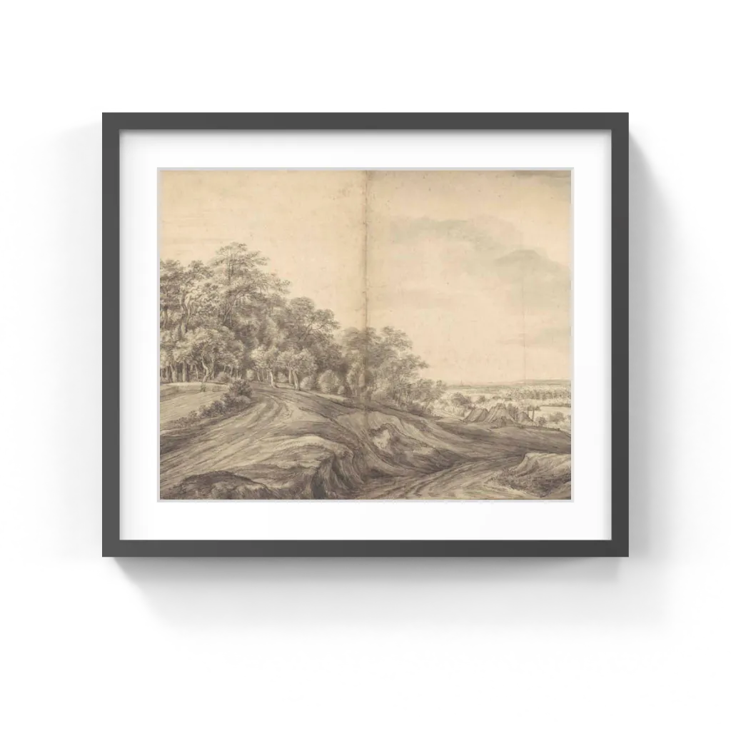 Simon de Vlieger (Dutch, about 1600–1653) Using two joined sheets of paper, Simon de Vlieger created a panoramic landscape of expansive space, contrasting textures, and varied rhythms. De Vlieger captured the land's erosion in striking, lyrical curves that take up nearly half the composition and provide an almost abstract pattern and visual rhythm. Above the land rise the soft, feathery trees whose texture contrasts with the earth's smoothness. Their strong, stable vertical thrust helps to balance the winding waves below. De Vlieger also balanced the left and right sides of the drawing, juxtaposing the trees' great height and the mound on which they stand with the wide vista of the town beyond.