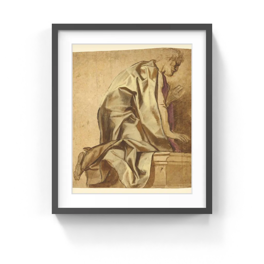 Jacob Jordaens (Flemish, 1593–1678) A male figure kneels down on a step or platform, with his left hand raised in a pointing gesture and the right lowered to give support. The drawing's bold lines and strong angles suggest a feeling of tremendous power and strength. Although the man's identity is unknown, scholars believe that the drawing might have been made as a study for an apostle who kneels in front of the Virgin Mary in an Assumption of the Virgin painting. In this large-scale drawing, Jacob Jordaens concentrated on the flowing drapery that covers the man's body from his neck to ankles, showing the way the light reflected off the folds in the fabric. Jordaens applied the black chalk energetically, describing the outline of the drapery with a thick, strong line. Various layers of colored pigments then added shadows to the fabric. He finished the work with an application of a thick coat of massicot bodycolor to highlight the cloak and violet wash to articulate the strip of lining visible behind the figure's left hand. A rough outline of another kneeling man stands out among the lightly outlined figures on the verso.