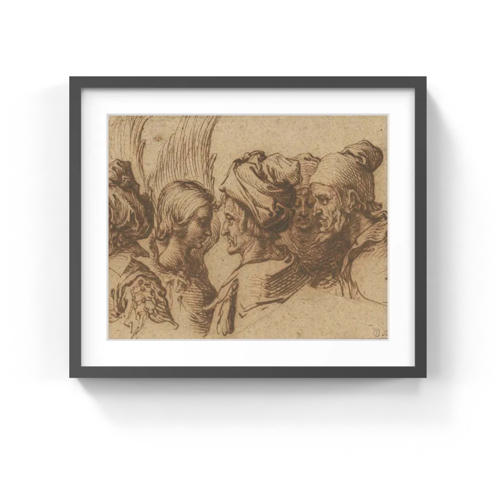 Jacques de Gheyn II (Dutch, 1565–1629) The young man on the left gazes steadily outward, capturing the viewer's interest with his direct stare. His features seem more realistic, more like a portrait than the other, obviously imaginary figures, and his position squarely facing the viewer also isolates him. The care with which Jacques de Gheyn II rendered the boy's fanciful costume also contrasts with the other heads. Paying close attention to the fall of light, de Gheyn evoked the textures of the youth's clothing--especially the turban--with beautiful, varied penwork that demonstrates the creases and gathers. He built up the other heads using rather somewhat more regular cross-hatching.
