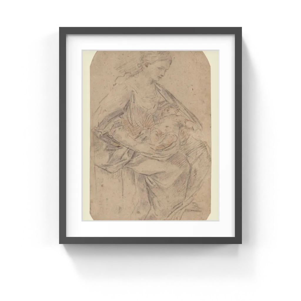 Guido Reni (Italian, 1575–1642) Though drawing the holy subject of the Virgin and Child, Guido Reni simply captured the intimacy of a woman cradling her infant. Other than their attractiveness, he gave no indication that this baby or this woman was divine. When he later painted the group as The Holy Family Adored by Saints Elizabeth and John the Baptist, he idealized the figures more and made them more majestic to indicate their biblical importance.