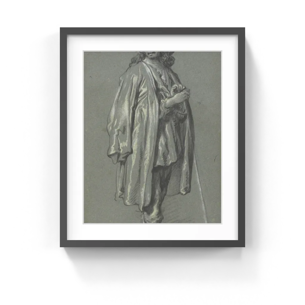 Working with great sureness, Govaert Flinck nearly completed a finished drawing except for the positioning of the cane, which he left uncertain. Using only black and white chalk against colored paper, he created a dynamic composition out of a single figure. The black chalk strokes outline the body and clothing, while the light chalk lines highlight the shimmering movement of the silk overcoat. These white tones appear to advance to the front, while the blue of the paper recedes into space. Although Flinck sometimes used his figure studies for paintings, he does not seem to have done so with this drawing.