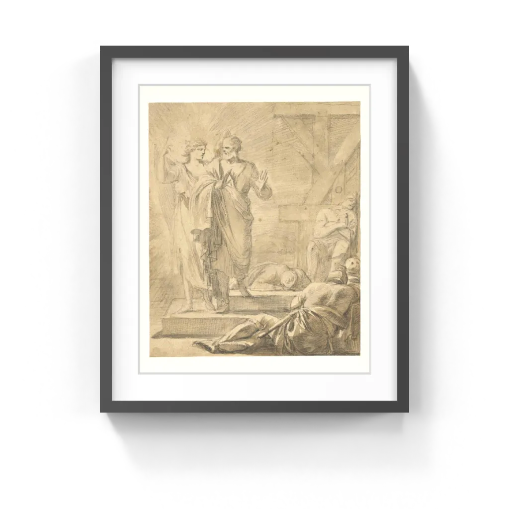 With its elegantly posed figures, carefully drawn drapery, and delicate combination of black chalk and brown wash, this scene epitomizes Laurent de la Hyre's refined, distinctive draftsmanship. Powerful lines representing supernatural light emanate from the angel and focus the viewer's eye on the two protagonists. Silhouetted against this brilliant light, Saint Peter's strong form resembles a three-dimensional statue. The bodies of the sleeping soldiers anchor the scene at the bottom, echoing the heavy, intersecting beams in the upper right.