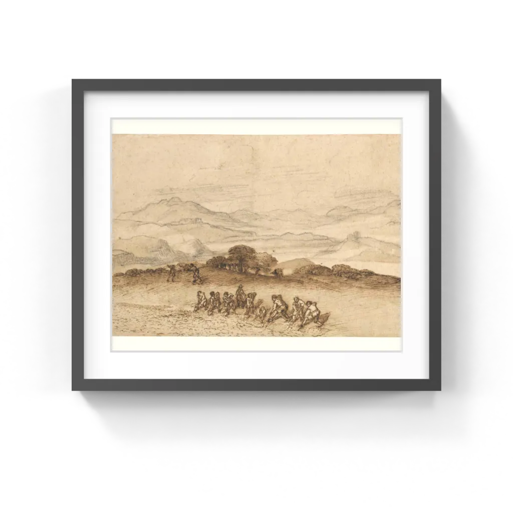 Claude Lorrain (Claude Gellée) (French, 1604/1605?–1682) Landscape painter Claude Lorrain rarely depicted scenes of everyday life. In this drawing set in central Italy, he expressed his interest in landscape by patterning the arrangement of figures on the lines of the mountainous background. In this expansive view, the jagged outlines of layered mountains echo the uneven row of workers turning the soil under an overseer's keen supervision. Pentimentiover the mountain peak at left show that Claude lowered its height to open the upper third of the sheet to sky. His spontaneity in rendering this scene suggests that it was probably sketched on the spot.