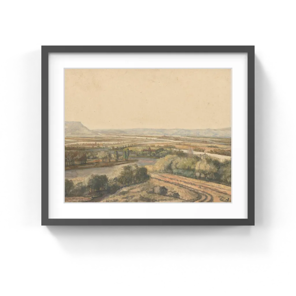 Philips Koninck (Dutch, 1619–1688) With color and line, Philips Koninck integrated his composition and encouraged spectators to journey into it. He began with the wedge of land in the foreground: rivers, road, and fields converge on both sides, then gradually lead the viewer into the distance. Koninck also created depth through aerial perspective: color and tone fade as space recedes. In contrast to many Dutch artists of the 1600s who exploited watercolor's brilliant, jewel-like hues, Koninck chose a soft palette of buffs and browns, deep green, gray, and light blue. He also made extensive use of bodycolor, applying this opaque mixture thickly and loosely, particularly in the foreground. His gentle background blue and smoky chiaroscuro effects evoke the atmosphere of a bright but hazy day.