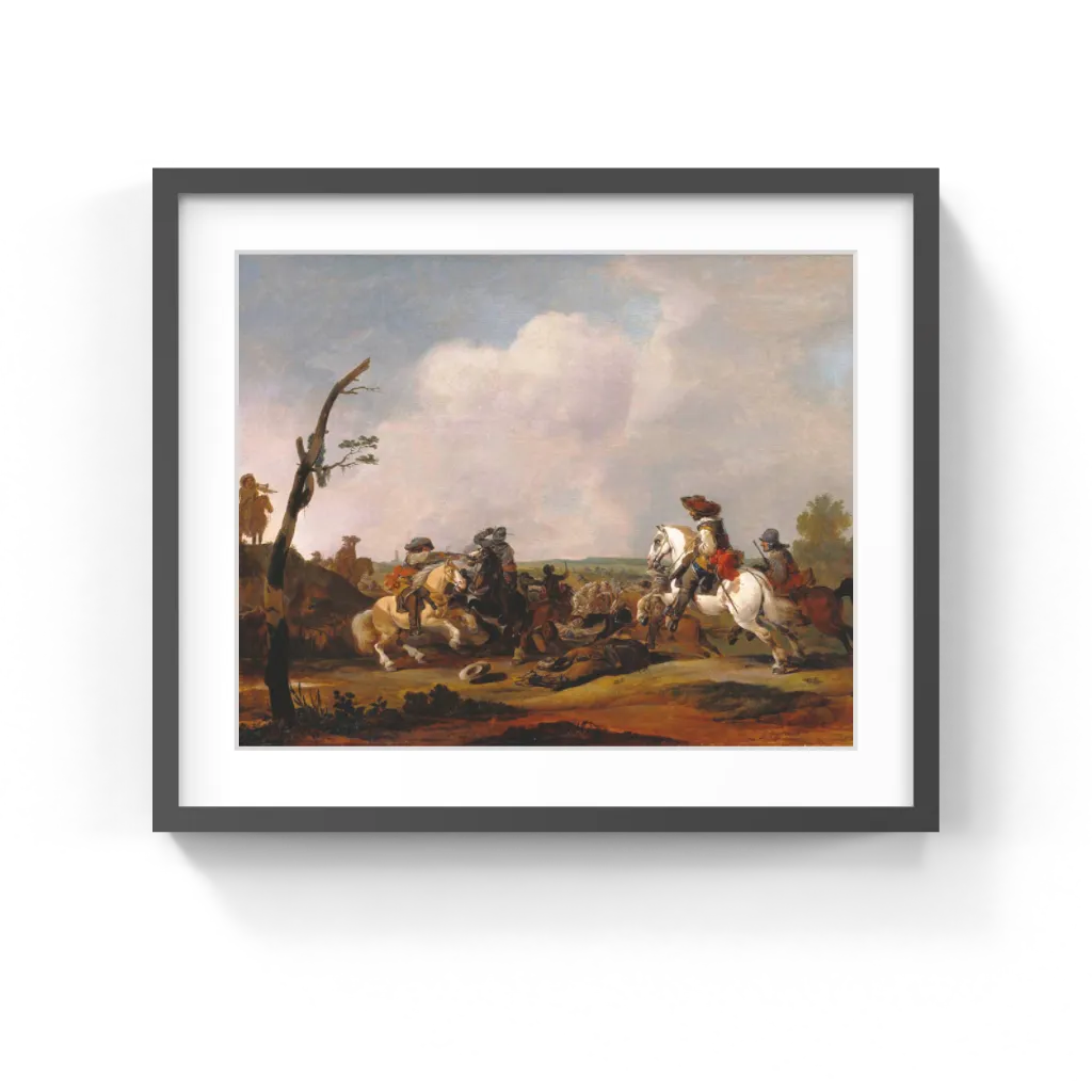 Attributed to Johannes Lingelbach (Dutch, 1622–1674) Johannes Lingelbach is only known to have painted three land battle scenes. For this painting, he probably closely studied the battle pictures of Pieter van Laer, a Dutch artist whose picturesque genre paintings of Italian street life and peasants also inspired Lingelbach. The pose of the soldier on a white steed at the right and his costume of a feathered hat, boots, and cuirass relate to Van Laer's works.