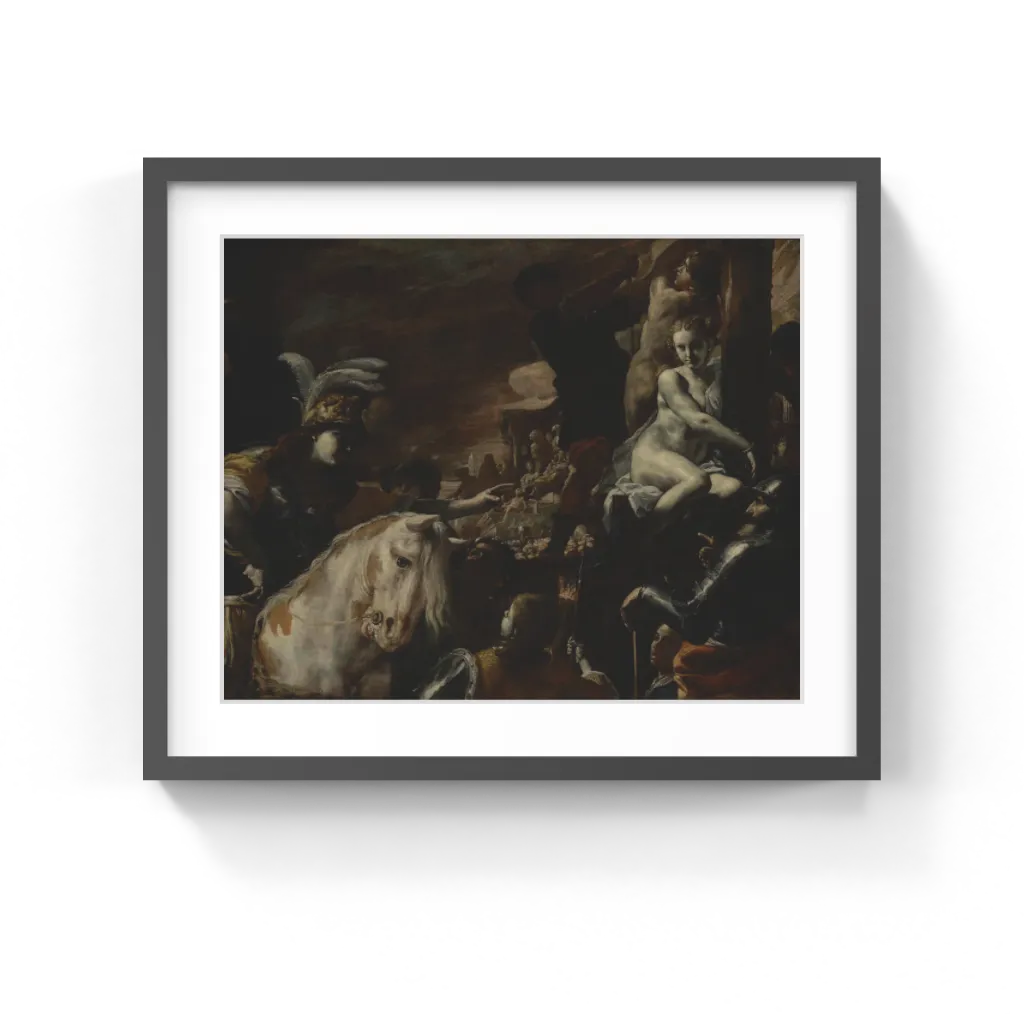 Mattia Preti (Italian, 1613–1699) In a plumed helmet, the Persian warrior-maiden Clorinda arrives on her white horse to save the lovers Sofronia and Olindo, who are about to be burned at the stake. The subject comes from one of the most popular books of its time, Torquato Tasso's epic about the First Crusade. When Aladine, the king of Jerusalem, threatened to execute the whole Christian community for the theft of a sacred image, Sofronia took the responsibility on herself to save the others. Her beloved Olindo then claimed to be the thief to save her, but Aladine condemned them both. Impressed by the young couple's courage, Clorinda saved them from the fire by offering to fight for the king in the coming battle with the Crusaders.