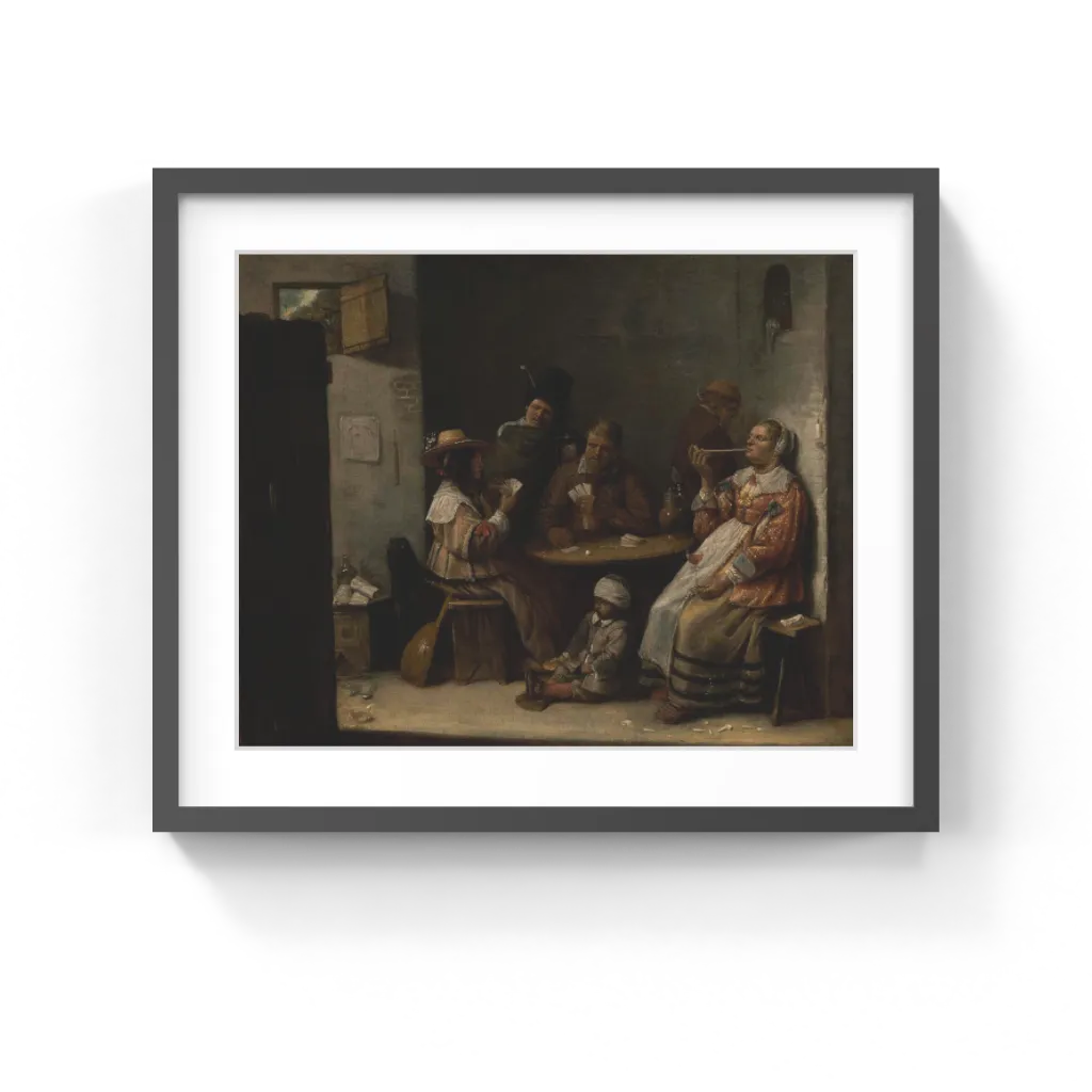 Craesbeeck presented peasants engaged in crude, dishonest, and vulgar activities. In this disreputable game of cards, the woman decides which card to play by examining her opponent's cards, which she sees in a mirror held up behind her opponent's back by her accomplice. At the right, another woman with a broken pipe at her feet drinks wine and smokes, while a man relieves himself against the wall. A seated child wearing a kind of turban plays on the floor. The woman with the straw hat and the bearded man, colored with great refinement, are characteristic types in Craesbeeck's repertory of figures. Possibly influenced by Caravaggio's followers, Craesbeeck paid careful attention to the effects of light, which streams into the room from a single window.