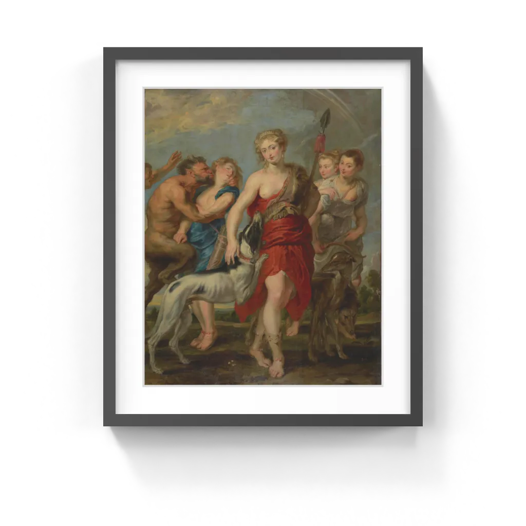 Workshop of Peter Paul Rubens (Flemish, 1577–1640) The robust figure of Diana strides into the foreground, swathed in a blood-red robe and clasping a spear behind her back. Much activity surrounds her: a dog jumps up at her side and a satyr tries to steal a kiss from one of her nymphs as another figure shouts behind him. The rhythmic composition, colors, and textures create a lifelike sensuousness, demonstrating the Flemish painter's mastery of Venetian color and his study of Roman art.