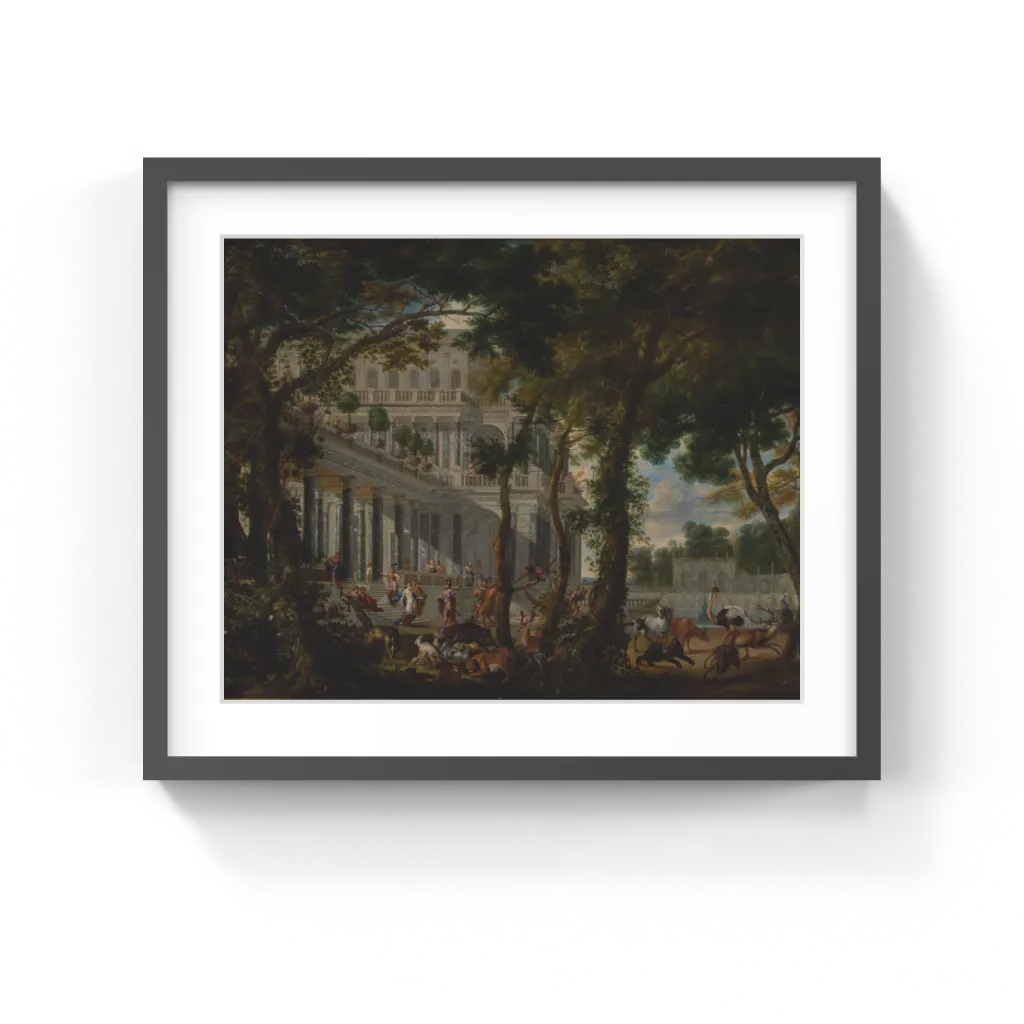 Wilhelm Schubert van Ehrenberg (Flemish, 1630–about 1676); animals by Carl Borromäus Andreas Ruthart (German, 1630–1703) Behind a grove of trees, a building looms imposingly. The painting depicts a story taken from Homer's Odyssey, in which the sorceress Circe encounters the warrior Ulysses. Descending the palace stairs on the left, Circe greets Ulysses and offers him a magic potion. Previous to his arrival, the sorceress had given the same potion to Ulysses's men, who were then transformed into wild beasts. On the right, one man sports antlers while another one nearby is horrified to find his head changing into that of a wild boar. Unbeknownst to Circe, however, Ulysses has taken an herbal antidote given to him by Hermes. Ulysses will overcome the sorceress and force her to restore his men to their normal shape.