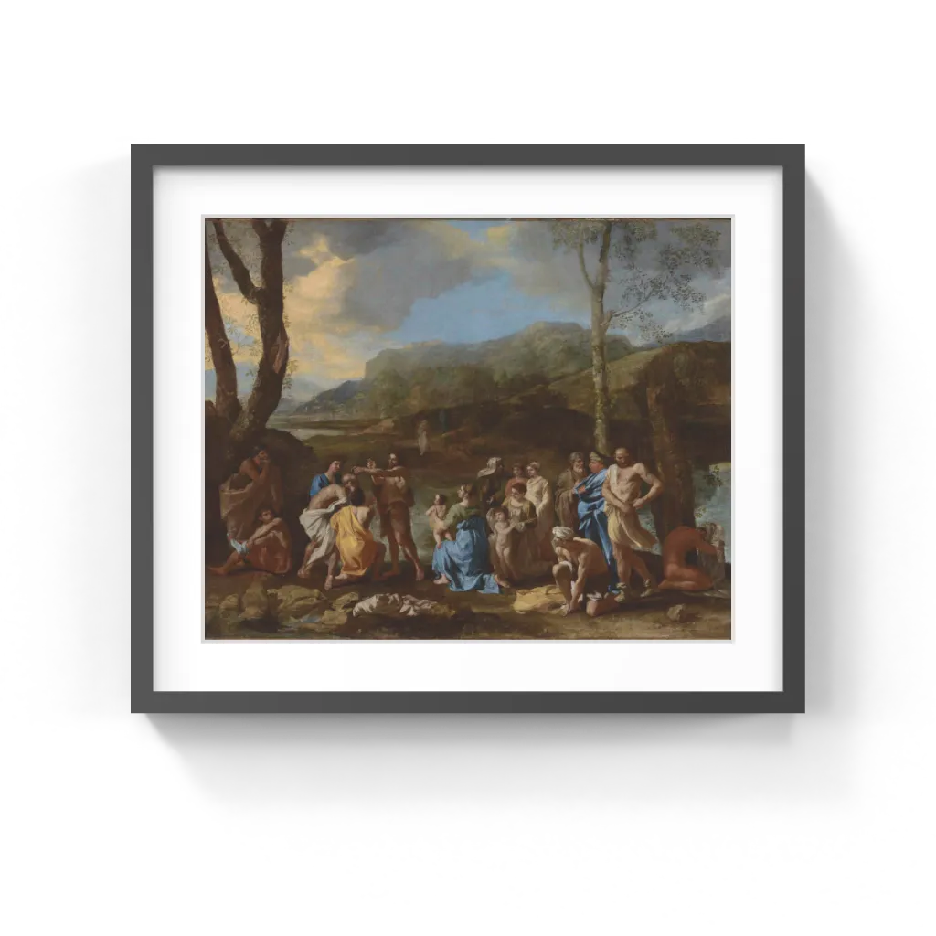Saint John baptizes the multitudes in an ideal landscape, framed by a tree trunk on each side. Clothed in antique costumes, the orderly followers have arranged themselves into a carefully balanced frieze. As always, Poussin approached this religious work from the tradition of order, clarity, and harmony associated with the art of ancient Greece and Rome.