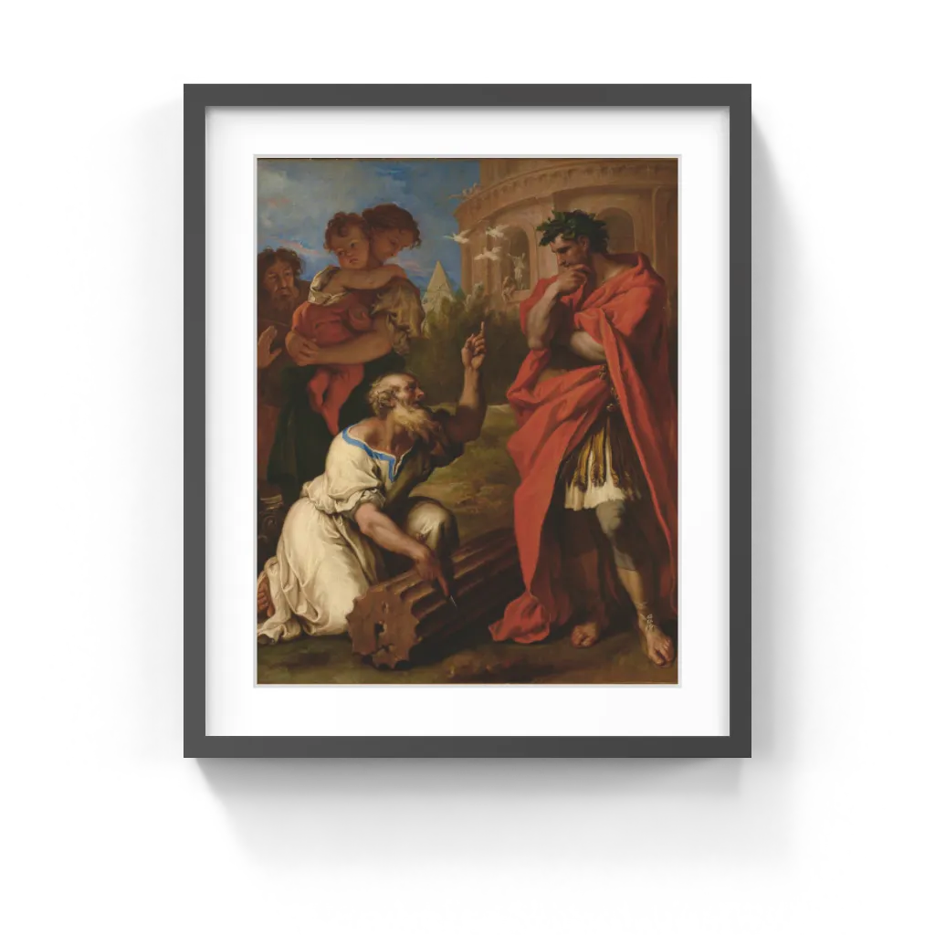Sebastiano Ricci (Italian, 1659–1734) During the war between the Romans and the Sabines in about 290 B.C., Tarquin, king of Rome, challenged Attius Navius, a fortuneteller, to read his mind. When Navius declared that Tarquin's thought would be accomplished, Tarquin revealed that he thought Navius would cut a whetstone in half with a razor, which he did immediately. Sebastiano Ricci took this subject from Livy's History of Rome,first published in A.D. 14, but he showed Navius cutting a column, a more aesthetic object.