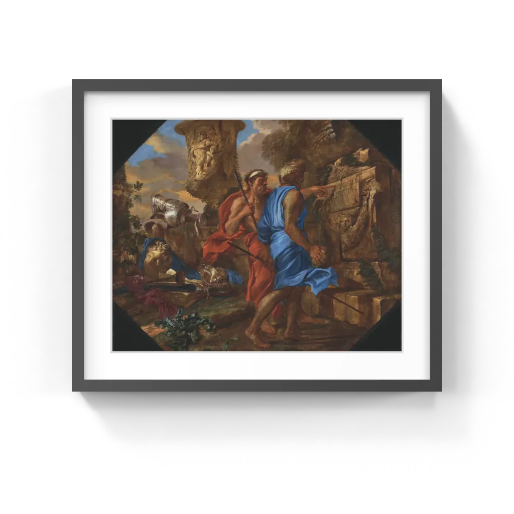 Giovanni Benedetto Castiglione (Italian, 1609–1664) Two Arcadian shepherds with coarse features discover a tomb inscribed with the words Temporalis Æternitas,alluding to the brevity or frailty of human life. The subject, one that Giovanni Benedetto Castiglione had borrowed from Poussin a decade earlier, was meant to remind viewers that time brings oblivion even to the highest achievements of humankind. An assortment of objects lying on the ground at the left--statues, musical instruments, a seashell, books, and armor--symbolize human accomplishments that have begun to crumble into ruin.