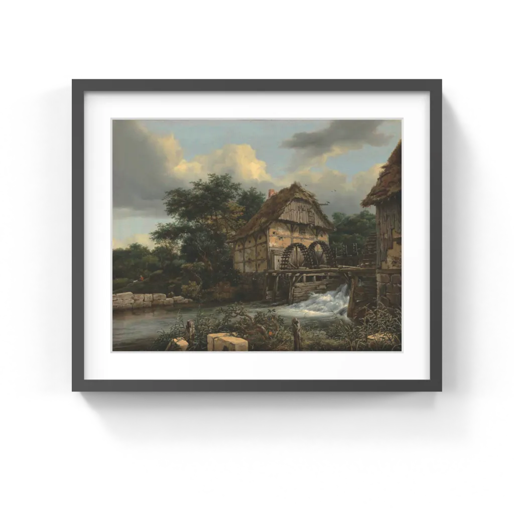 Jacob van Ruisdael (Dutch, 1628/1629–1682) Jacob van Ruisdael captured the tension between nature's power and human needs. Glimpsed from the bank of a stream amid thick foliage, turbulent waters rush through an open sluice. Inclement weather is suggested by the dark clouds; uneven, craggy branches and spreading trees grow on either side of the river. Against the ominous sky, the buildings appear solid and sturdy, and a solitary male figure with his dog seems dwarfed by the natural setting. Sunlight breaks through the heavily clouded sky and settles on the central motif of the two half-timber thatched millhouses.