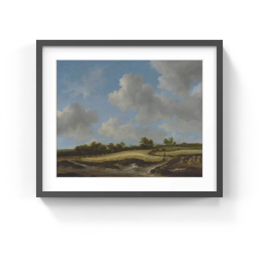 In a poetic, yet convincing manner, Jacob van Ruisdael captured the changing effects of light passing through clouds and the play of sunlight and shadow across the earth. He contrasts the uncut wheat in the field and the newly bound sheaves on the right, the broad expanse of blue sky above and the low, yellow fields below. Dwarfed by their surroundings, the small figures convey the insignificance of humanity in the face of nature.