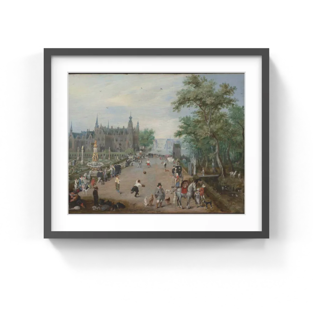 Adriaen van de Venne captured the idle pleasures of courtship and leisure in this small painting. Lining a wide lane, an assortment of people watch a game of ball. To the left, a formal garden with flowers and sculptures is laid out in front of a large fantasy castle. In the left foreground, two lovers sit in shadow near an overturned lute and a pile of clothing discarded by the ballplayers. On the right is an enclosed forest area with goats and deer.