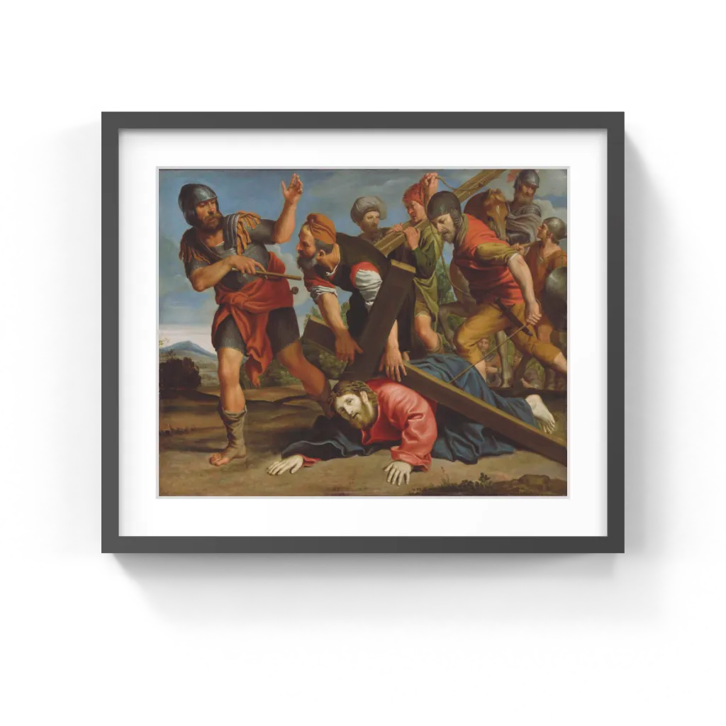 Domenichino (Domenico Zampieri) (Italian, 1581–1641) In this depiction of Christ’s arduous journey to his own crucifixion, Domenichino situates Christ at the forefront of the composition, gazing sorrowfully out at the viewer. Christ’s oppression and the cruelty of his tormentors are emphasized by the crowded composition, in which the figures seem to bear down upon the heavy cross that pins Christ to the ground. A Roman soldier in armor and sandals leads the procession and gestures with a baton at Simon of Cyrene, who tries to assist the fallen Christ. Behind them, another soldier tugs sharply on the rope tied around the prisoner’s body and raises his right arm to whip his back. Shocked faces from the civilian throng that accompanied Christ to Calvary are visible between the soldier’s legs.