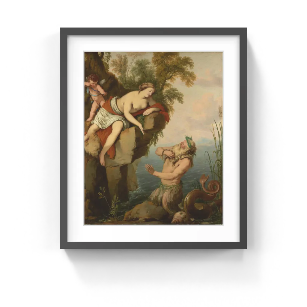 Laurent de La Hyre (French, 1606–1656) The sea god Glaucus pulls aside his beard, revealing Cupid's arrow protruding from his chest. Looking up, he sees the maiden Scylla on a rocky cliff and pronounces his love for her.