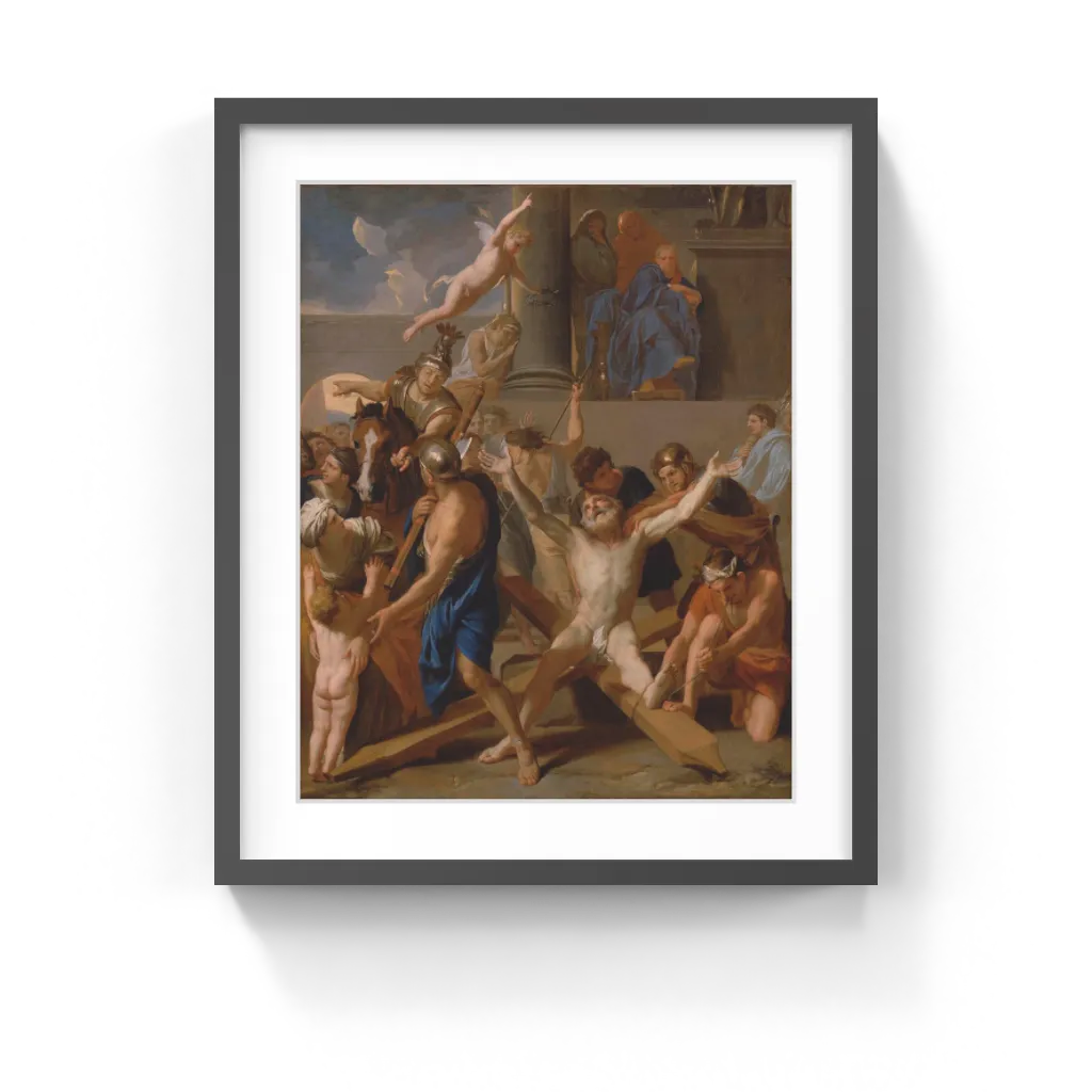 Charles Le Brun (French, 1619–1690) Arms thrown wide, Saint Andrew implores the heavens above while soldiers tie him to a cross in the shape of an X. His executioner, the Roman governor Egeas, watches from a classical porch above, and confusion reigns as soldiers try to push back the surging crowd. Charles Le Brun heightened the emotion of the figures by contrasting the stern, silent figure of the emperor with the chaos below. He used gesture, facial expressions, and strong colors to create a dynamic composition in the theatrical Roman setting.