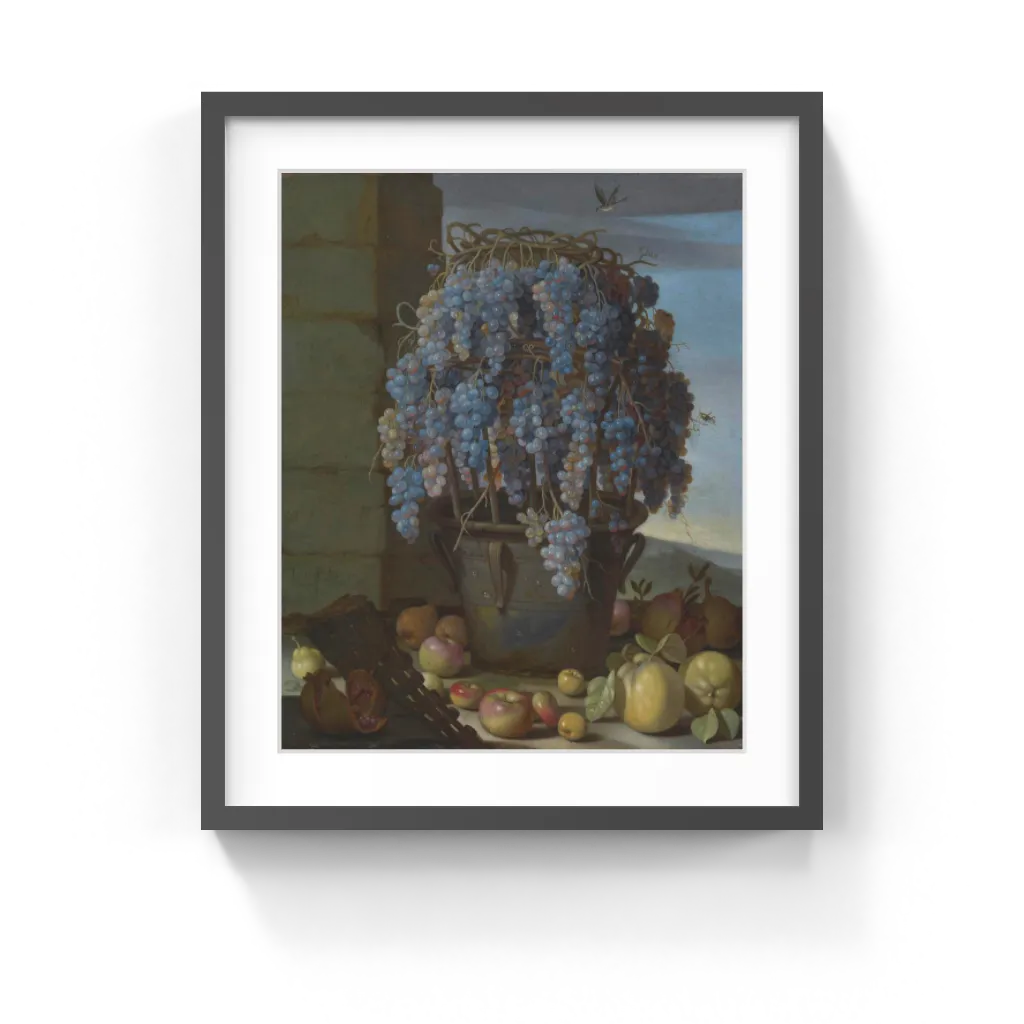 Luca Forte (Italian (Neapolitan), about 1610/1615–about 1670) Luca Forte's original meaning for this bountiful still life has been lost, but it may be an evocation of the bounty of autumn. The grapes, apples, and pears represent harvest fruits, and a seed-filled open pomegranate itself symbolizes abundance. As here, Forte typically added tiny insects, snails, and drops of moisture to the fruit. By painting on a copper panel with painstaking brushwork, he gave his surfaces a polished smoothness similar to fine enamel.