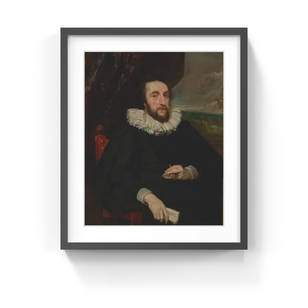 Anthony van Dyck (Flemish, 1599–1641) Depicted three-quarter length, the Earl of Arundel sits before a tapestry curtain on the left and a landscape background on the right. The long, tapering fingers of his left hand hold the gold medallion of Saint George, one of the emblems worn by the twenty-four knights who made up the most eminent and noble circle around the king. His elongated, pale face contrasts with the white ruff around his neck and the scarlet chair upon which he sits. Turned slightly towards the viewer, the expression on Arundel's face is alert but reserved.
