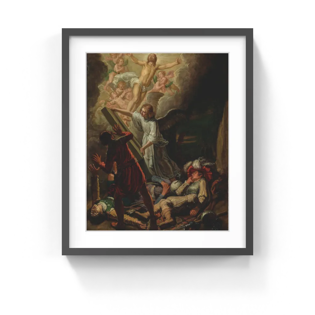 In The Resurrection, Lastman emphasized the expressive power of the miracle taking place, contrasting divine light with the doom of the unredeemed. An angel gently lifts the heavy lid from the tomb as Christ ascends to heaven surrounded by putti. Bright light from Christ's halo illuminates the standing angel and throws into shadow the standing soldier with upraised arms, outlining his bright red costume. A terror-stricken soldier sprawls on the ground with his head thrown back and his arm raised as if to ward off a blow. To the right, a turbaned man shields his eyes while a soldier in a plumed hat sleeps. In the background, rays from the rising sun light the approach of the three Marys.
