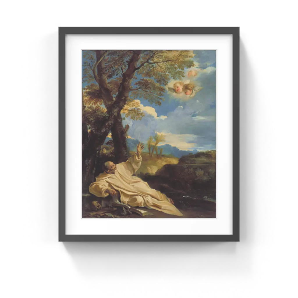 Pier Francesco Mola (Italian, 1612–1666) During his devotions in the wilderness, Saint Bruno, the founder of the Carthusian order, a monastic community committed to solitary meditation, experienced a vision. Gazing intensely up at the sky, the saint tentatively reaches out to touch the mystical illusion of angels appearing in the sky. To the left, two tall trees cross each other at an angle, forming a cross. Below the rolling clouds, hills and land gently recede into the distance.