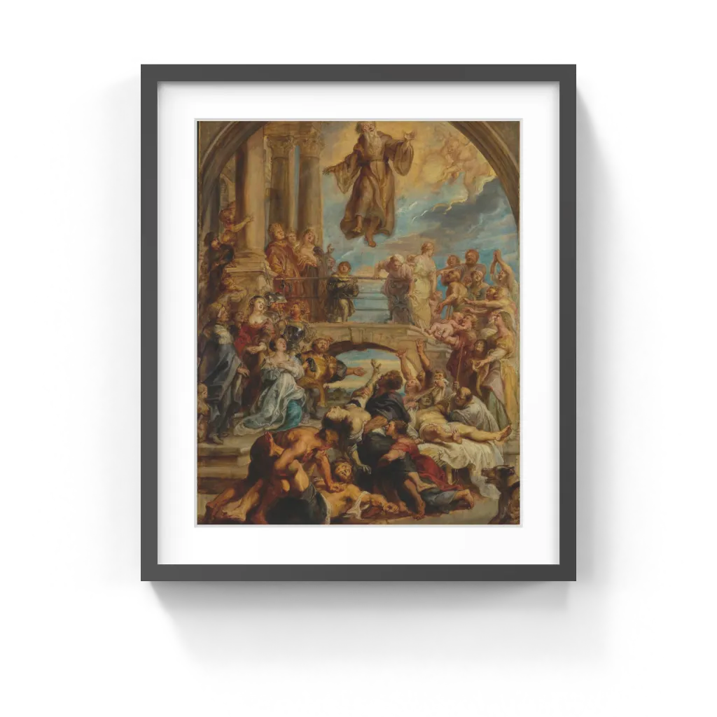 Peter Paul Rubens (Flemish, 1577–1640) Arms outstretched, Saint Francis of Paola levitates while surrounded by a divine light. The crowd surges towards the saint, whose expression conveys his communion with God at the apex of the composition. Famed for his miraculous healing powers, Saint Francis of Paola was invited to France by the sickly King Louis XI, who is shown at the left with his royal court. In the foreground, a man and woman in paroxysms of insanity are restrained while awaiting their cure. To their right, a dead man comes to life as a sheet is symbolically lifted from his face. An assortment of people, some afflicted with blindness, deafness, lameness, or the infirmities of old age, ascend the stairs. The varied gestures and expressions enhance the dramatic effect of the whole.
