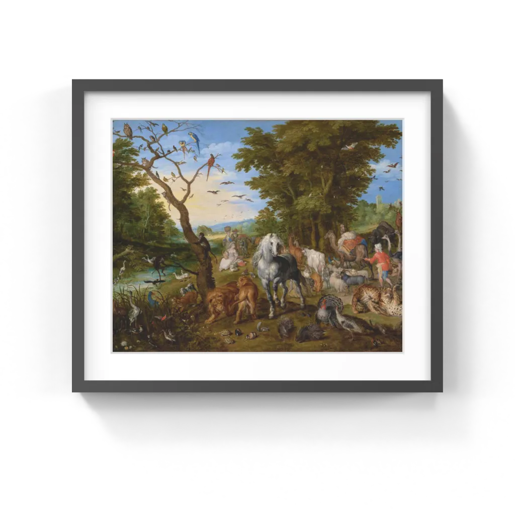 Jan Brueghel the Elder (Flemish, 1568–1625) A profusion of animals fills the earth and sky. Fighting, playing, climbing, flying, and swimming, they are shepherded by Noah toward the ark in the far distance. All species of animals are portrayed, from large lumbering elephants to tiny turtles and hamsters in the foreground. Bats and birds soar across the sky, receding into the background where brighter skies hold promise of a future.