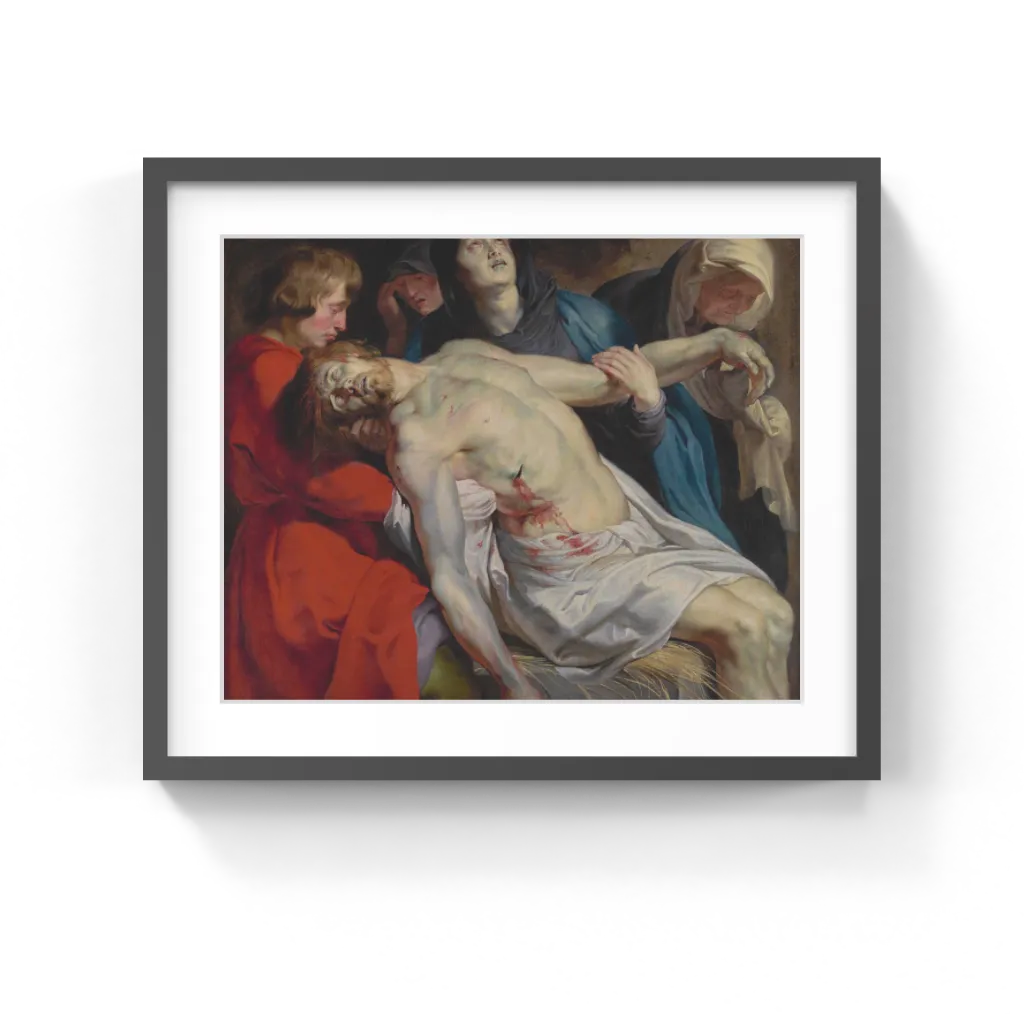 Peter Paul Rubens (Flemish, 1577–1640) Peter Paul Rubens depicted the moment after the Crucifixion and before the Resurrection when Christ is placed into the tomb. He is being supported by those closest to him in life: John the Evangelist, in a brilliant red robe, bears the weight of Christ; Mary Magdalene cries in the background; while Mary, the mother of James the Younger and Joseph, bows her head in sorrow. Mary, the mother of Christ, cradles his head and looks heavenward for divine intercession.
