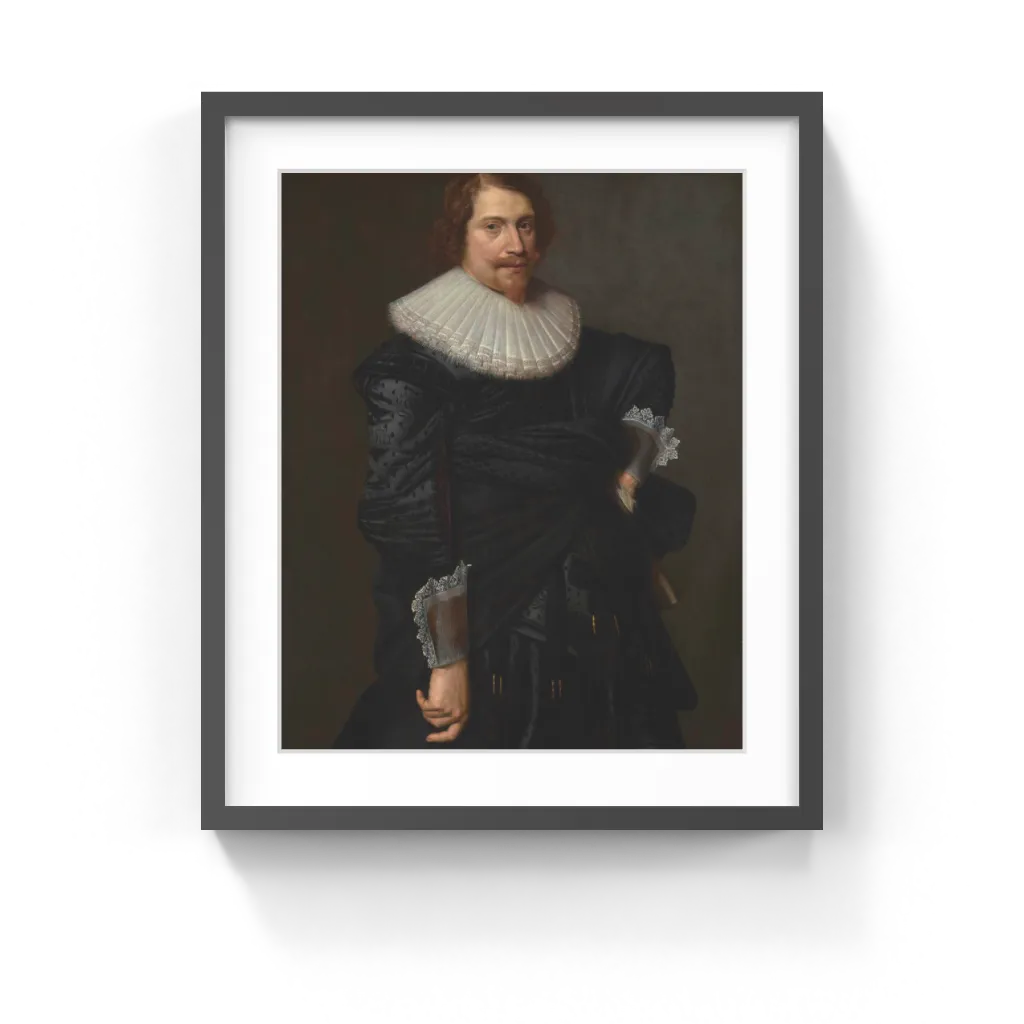 In the three-quarter length view favored for men of his day, a young, bearded man faces diagonally to the picture plane with his left arm crooked and his hat in his right hand. His pose closely mirrors that of his wife, except that the husband's gaze and stance are more assertive while the wife's are more demure. He wears a rich black embroidered doublet with a black cloak folded around his waist and held in position by the gloved hand on his left hip. Precisely rendered white lace cuffs and collar enliven the restrained black costume.