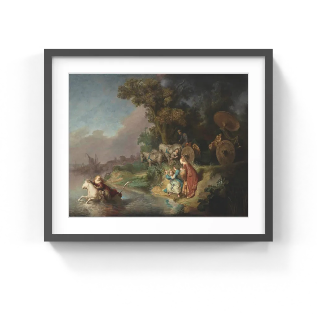 During his long career Rembrandt rarely painted mythological subjects. Here he conveys a narrative story through dramatic gesture and visual effects. Bewildered, Europa grasps the bull's horn, digs her fingers into his neck, and turns back to look at her companions on the water's edge. One young woman falls to the ground and raises her arms in alarm, dropping the flower garland intended for the bull's neck into her lap, while her friend clasps her hands in consternation and watches helplessly. The carriage driver above rises to his feet and stares at the departing princess in horror. In the background, a city shrouded in mist extends along the horizon, perhaps serving as an allusion to the ancient city of Tyre as well as to contemporary Amsterdam.The dark thicket of trees to the right contrasts with the pink and blue regions of the sea and sky. Sunlight breaks through the clouds and reflects off the water, but the sky behind the trees is dark and foreboding.