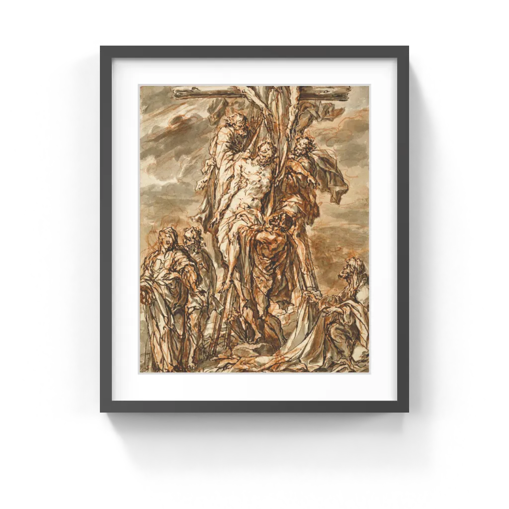 Phillip Roos (German, 1655/1657–1706) After Joseph of Arimathea obtained permission from Pontius Pilate, he and Nicodemus took Christ's body down from the cross and swathed it in strips of linen cloth, with myrrh and aloes to preserve the body. One of the two men kneels on the right, while the Virgin Mary and Saint John the Evangelist observe from the left. Although some compositions of the subject also include a crowd of bystanders, Phillip Roos limited his design to the essential figures, thereby focusing attention on the central body of Christ. Roos's frenzied dark lines contribute to the scene's power and drama. He outlined the cross, figures, and drapery using pen and brown ink, before adding sweeping strokes of gray wash to heighten the stormy atmosphere. Scholars previously thought that Roos drew only landscape and animal studies, yet this sheet shows him capable of managing complex figure compositions. As he prominently signed and inscribed the work invinit, a Latin phrase meaning to invent or design, Roos himself was obviously proud of this drawing.
